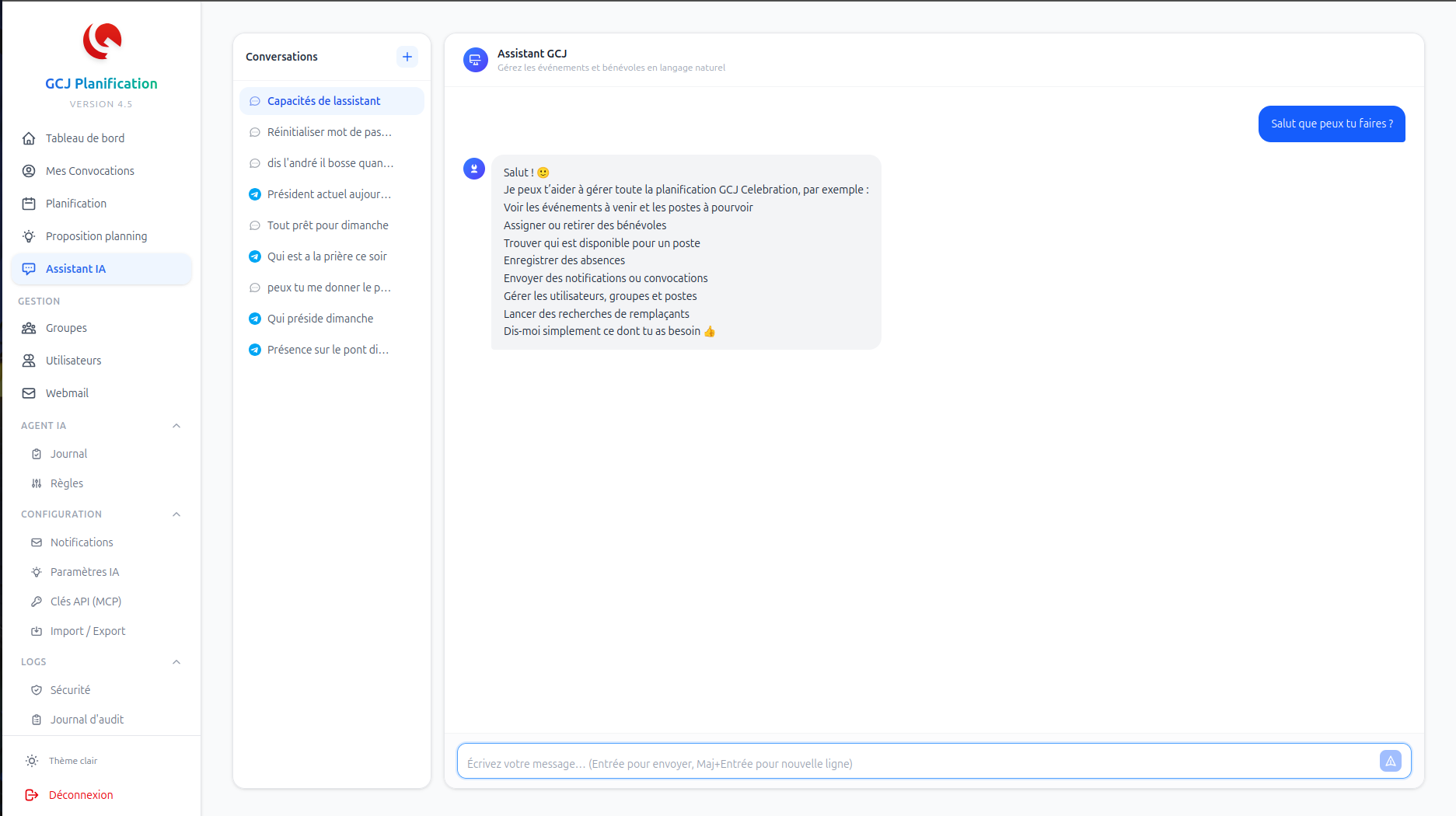 - Analyse quotidienne : chaque matin à 8h, l'agent vérifie les 10 prochains jours. S'il manque un bénévole sur un poste critique, il alerte automatiquement le responsable du groupe.