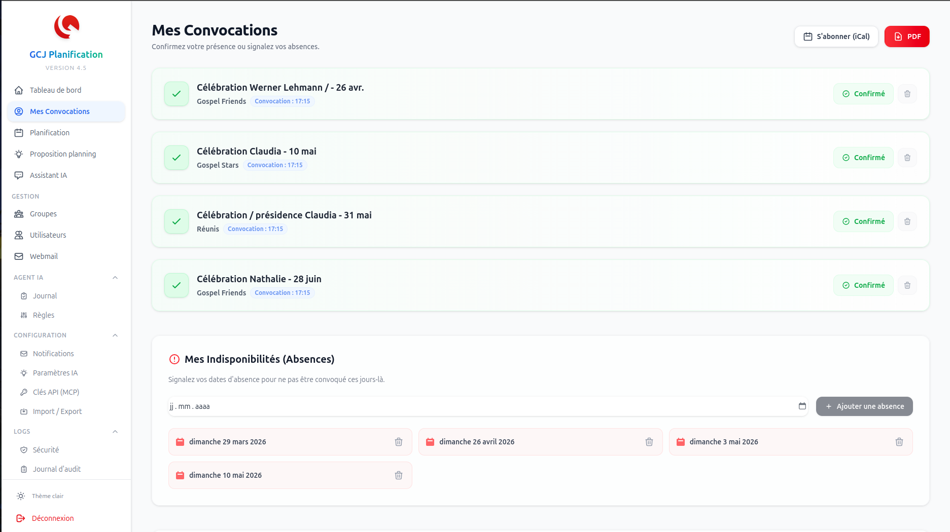 - Un tableau de bord personnel avec leurs prochaines convocations
