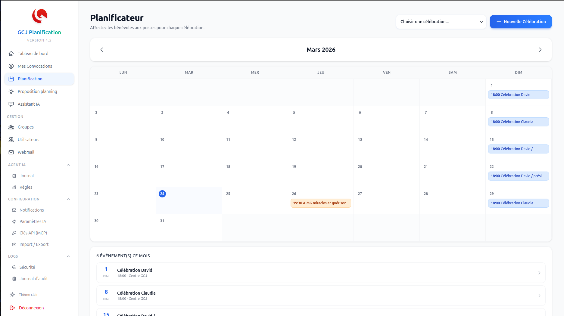Celebration est une application web complète que j'ai développée pour résoudre ce problème de bout en bout. Elle couvre toute la chaîne : de la création des événements jusqu'à la notification des bénévoles par email, SMS ou Telegram.
