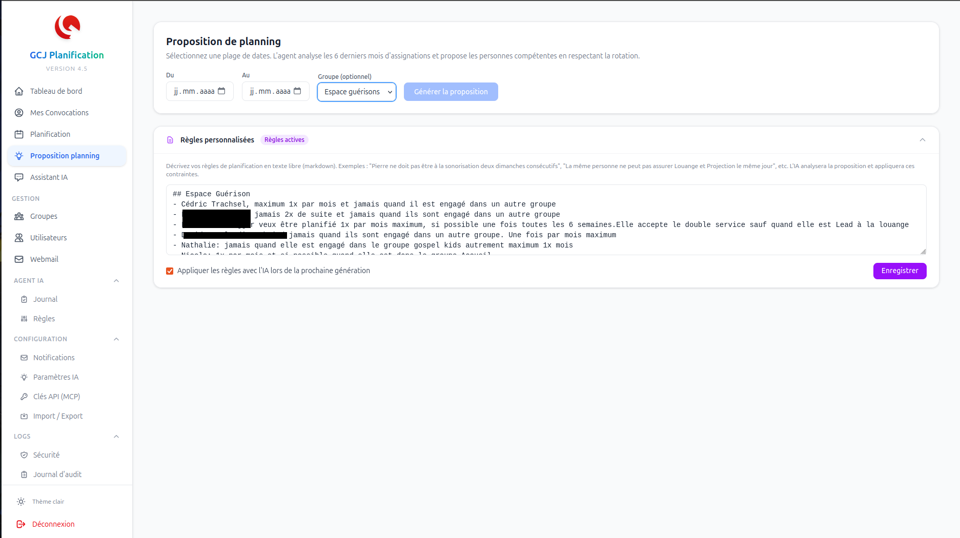 L'IA lit ces règles, détecte les violations dans la proposition algorithmique, et applique des corrections automatiques parmi les candidats disponibles. Un résumé des ajustements est affiché, et chaque modification est clairement identifiée.
