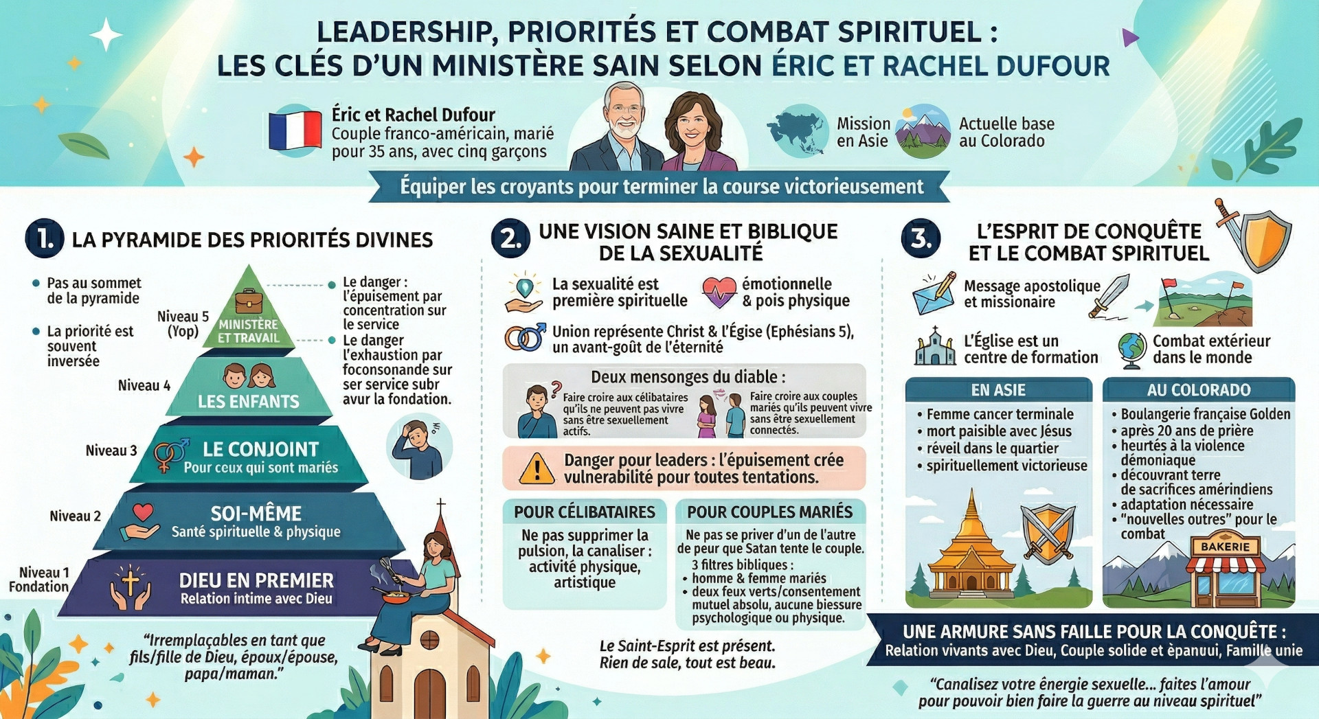 Éric et Rachel, un couple franco-américain marié depuis 35 ans et parents de cinq garçons, ont consacré leur vie au service de Dieu. Ayant œuvré comme missionnaires en Asie du Sud-Est et résidant aujourd'hui au Colorado, leur appel principal est d'équiper les croyants et les leaders pour qu'ils puissent « terminer la course victorieusement ».